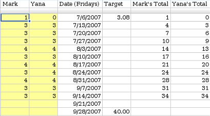 First, a fairly simple one: Yana and I set a personal goal to ride our bikes to work 40 times this quarter. This works out to a little over 3 days per week, average. I wanted a simple chart of our progress, so I made a table with 6 columns: Mark, Yana, Date, Target, Mark’s Total, and Yana’s Total. The first two columns are for entering data, the last 4 columns calculate the data for the chart. I intentionally didn’t put the Date column first. Google Spreadsheet can only graph contiguous data, so I needed to keep the date column next to the target & totals.