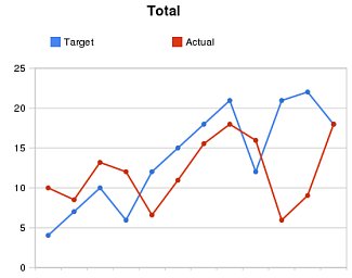 The target column shows our goal on the chart so we can see how we are doing. The last two columns calculate running totals (simply a matter of adding this weeks values to last week’s totals). I charted the last 4 columns (C1:F14) using a line chart with dots, with both Row 1 and Column C as labels.
